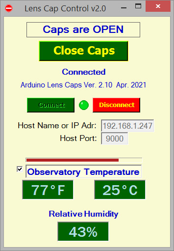 The bottom area of the window displays the ambient temperature and humidity in the observatory if you have installed the optional sensor.