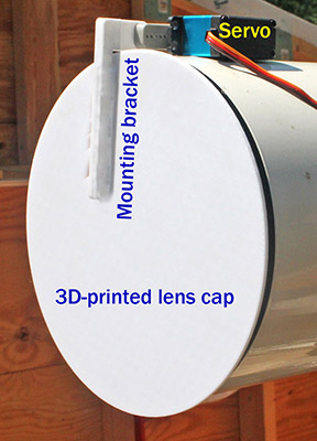 A servo motor mounts on top of your telescope, with an L-shaped bracket attached to its shaft. The bracket is glued to a lightweight 3D-printed plastic lens cap.
