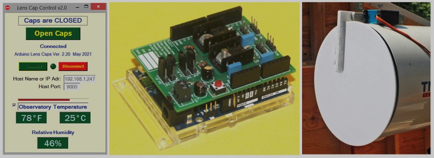 The TLCC uses an Arduino microcontroller and one or two servo motors to open and close one or two lightweight 3D-printed lens caps. A control program on your PC sends commands to the Arduino, and receives status information back.
