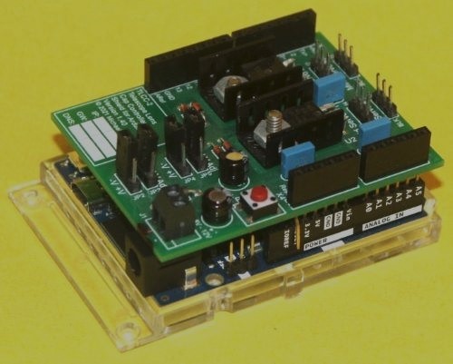 This is the TLCC "stack" (of circuit boards) you install on or near your telescope. An Arduino microcontroller is the heart of the system, with one additional circuit board called a "shield" plugged on top to power one or two servos.