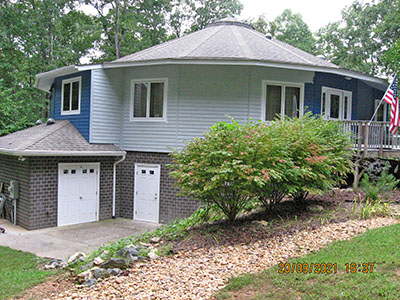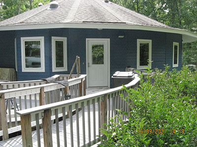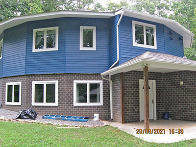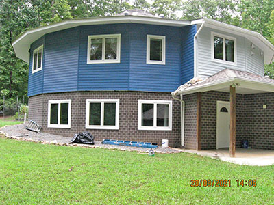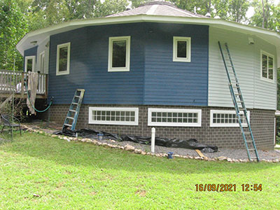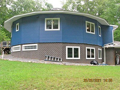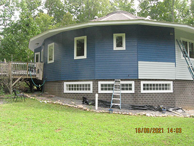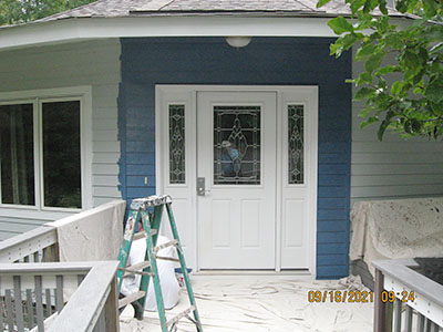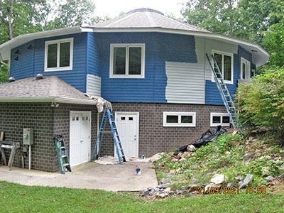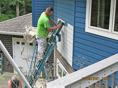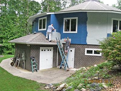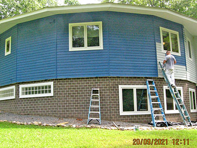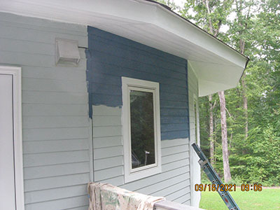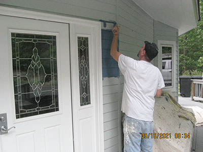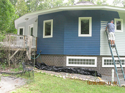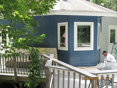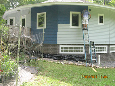 In September 2021, after nearly 11 years in our house, we changed the exterior color from pale‑pale green to deep blue, and repainted the trim semi-gloss white. Jeff the painter and his helpers used a brush for nearly the entire job. These photos show the progress over several days.