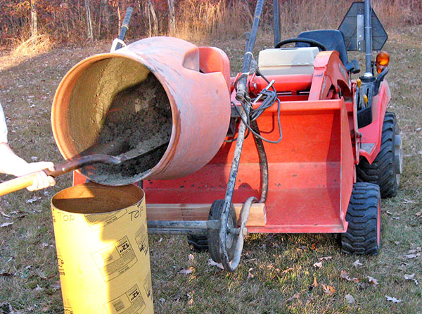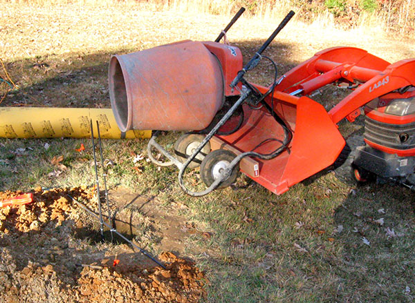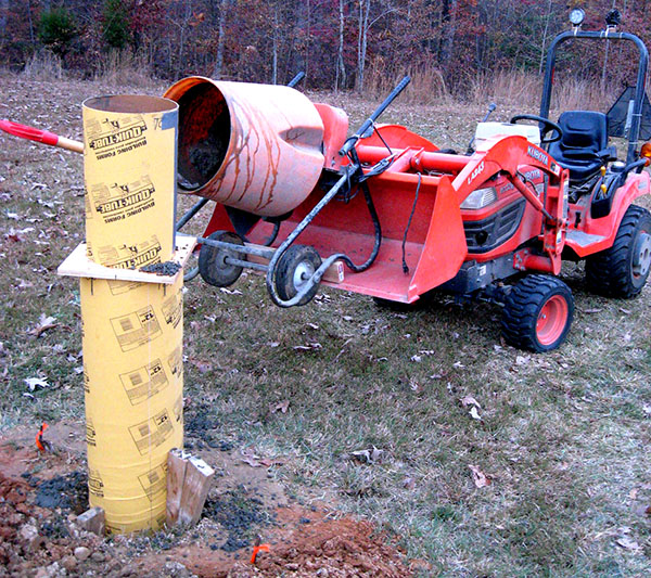 We used our power auger to bore a 16"-diameter hole 28" deep. We rented a concrete mixer, and Mike secured it to the tractor's front-end loader so we could lift and tip it to ease the work. Here it is ready to pour concrete for the footer into the hole.