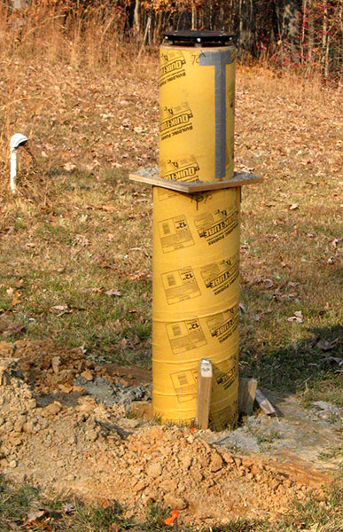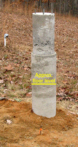 After the footer concrete set slightly, we placed the 12" tubular form on it and used large wedges cut from 2x4 stock to shim it plumb (second photo below). Then we filled it with concrete. In this case, Louise shoveled the concrete out of the mixer into the form because we didn't want to dump it and risk spilling outside the form.