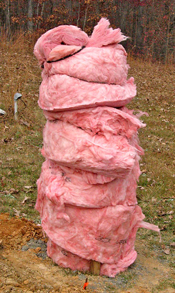 Mike wrapped the pier with R30 fiberglass insulation to keep the concrete from freezing while it cures completely. After this photo was taken, he draped a tarp over the insulation to shield it from rain.