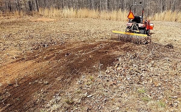 Earlier this week Mike clamped pallet forks to the tractor's front-end loader, and used them to carry the leftovers into the woods. Today he used the tractor and landscape rake to drag the rotten wood to the same spot, then smoothed the burn area.