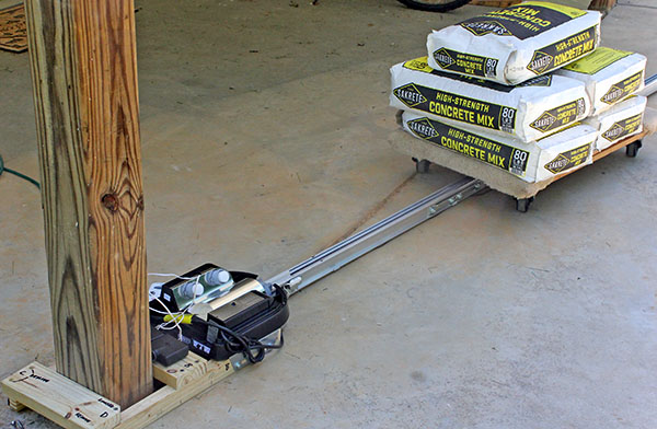 To test, we secured the opener to a 6x6 post and attached the trolley to a dolly loaded with five 80-pound bags of concrete mix. (The attachment is hidden by the concrete in this photo.)