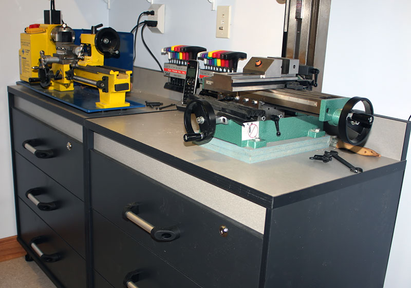 This time, we splurged and bought heavy-duty base cabinets with ready-made tops, instead of using a kitchen sink base with a formed countertop, and making shallow drawers in the sink base, as we did in our former house. The drawers are full-suspension, and hold lathe and mill accessories, measuring tools, chucks, a rotary table, and a granite surface block.