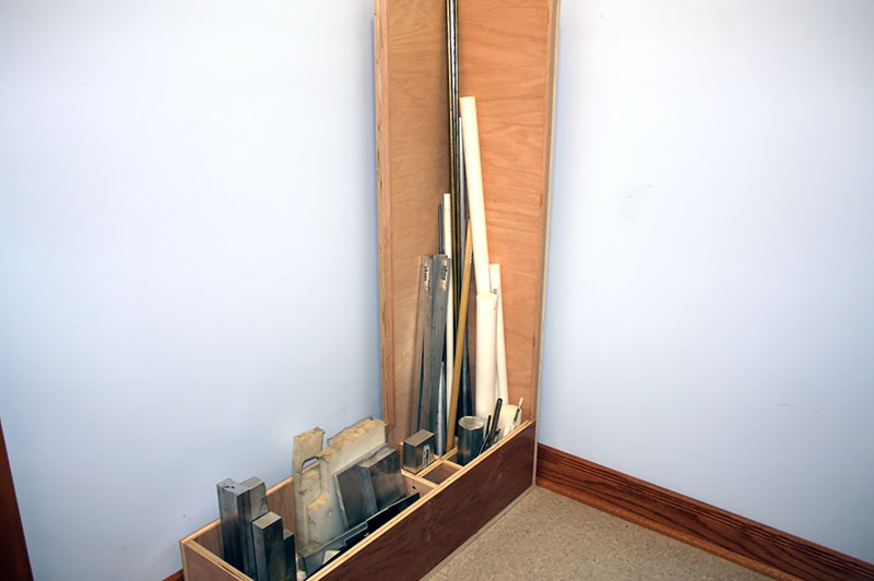 Finally – after four years of storing short raw material in cardboard cartons, and leaning long pieces in a room corner – I built a wooden box to hold everything. The tall end prevents long stock from marring the room walls. The box is constructed of ¾" oak plywood left over from making built-in bookshelves for our new house.