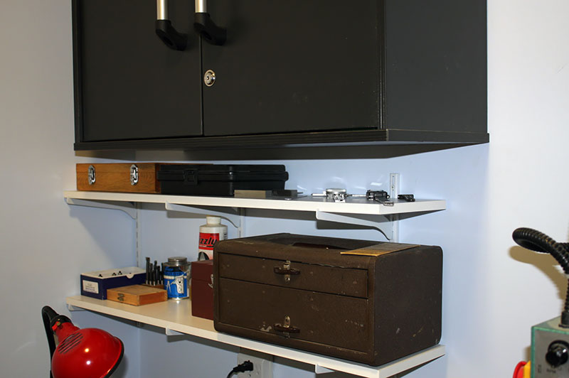 On the wall behind the equipment bench are two shelves and a cabinet. The shelves hold frequently used tools like calipers, lathe cutting tools and holders, parallels for milling, end mills in a case, machinist's squares, steel rules, and a Kennedy toolbox to store small tools and accessories.