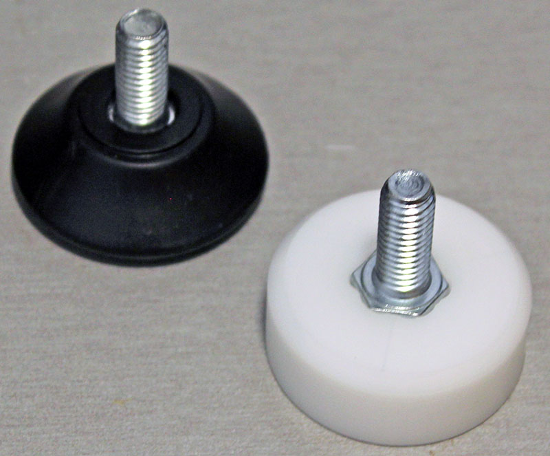 The bolt fits tightly into the hole, used a dollop of Goop adhesive to keep it there, and declared it done. Here is the Delrin foot, with one of the originals behind it.
