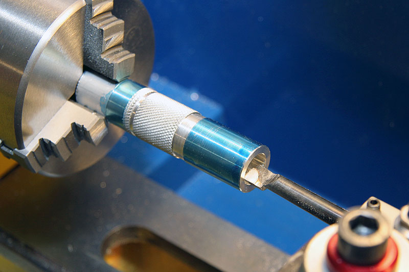 I drilled a large hole into the stock, then used a boring tool to enlarge it to slightly larger than ½", so the knob would fit over a brass tube in the telescope. I cut off the stock near the end of the knurling, then took a finishing cut on that end. The knob was finished after I drilled and tapped a hole for a set screw to secure the knob on the brass focuser mechanism.