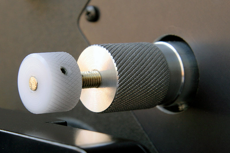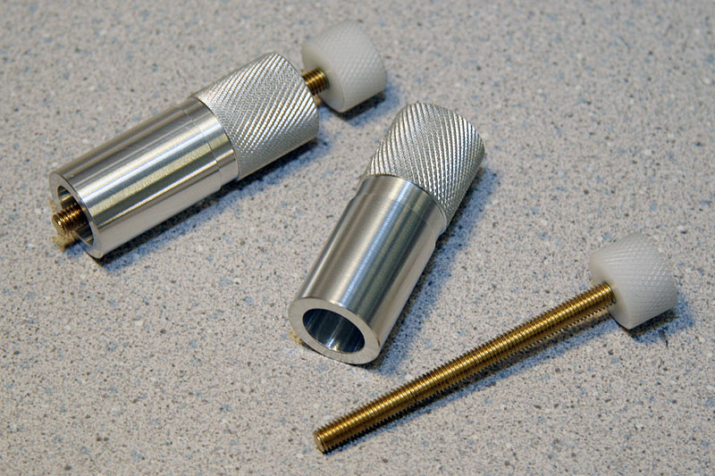 With the knob finished, I cut a 6" length of ¼" threaded brass rod, drilled and tapped a ¼"-20 hole in the closed end of the knob, then machined a knurled knob from Delrin. I drilled and tapped a hole for a set screw in the knob, and threaded the rod into the knob. When tightened against the telescope's focusing mechanism, this rod locks it in place.