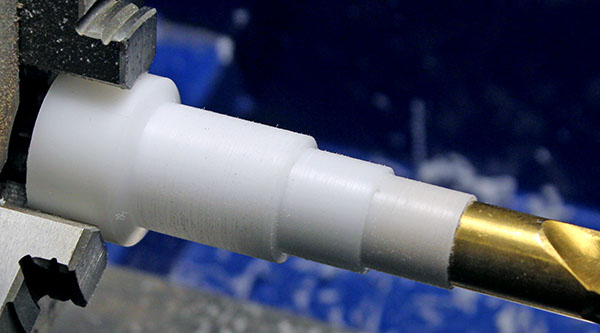 To achieve this, I first turned the two larger diameters, then bored the ½" hole with progressively larger bits. Finally I inserted the smooth shank of the ½" drill bit into the hole to serve as a mandrel while I turned the smallest diameter.