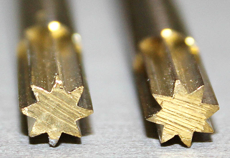 Here's a close-up of the splines. The shafts are ¼" round brass stock. The angle between faces of each cut is 90°. Some angles appear more acute, but this is an illusion caused by the camera angle. A square-end mill can cut only 90° angles.
