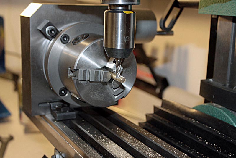 To machine the splines, I removed the three-jaw chuck from the lathe and installed it on a rotary table attachment for the milling machine. I used a regular end mill to cut the spline. After each cut, I rotated the shaft 45° and made the next cut. Eight cuts, and the spline was finished.