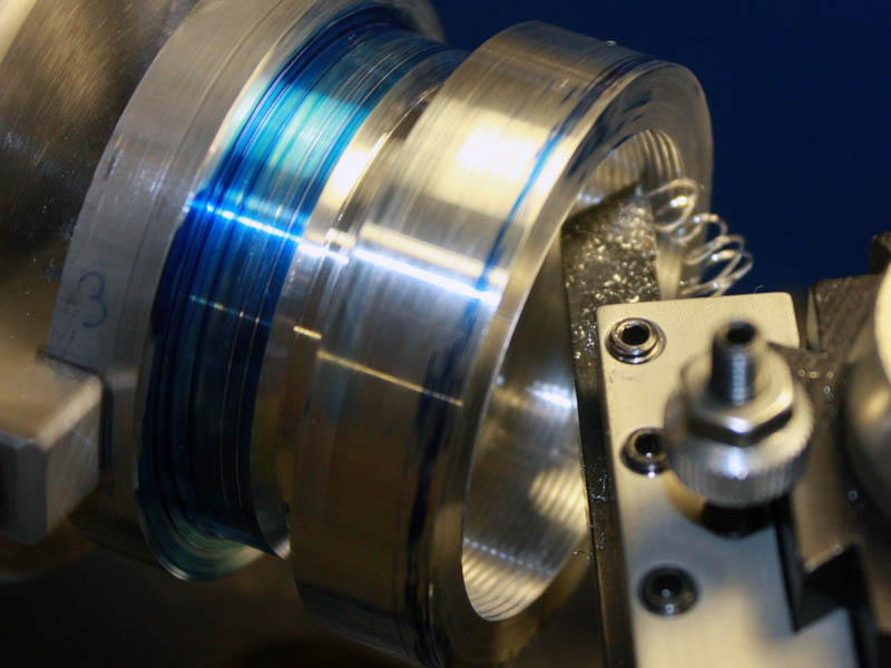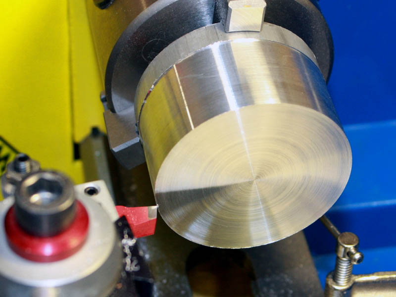 I chucked the blank stock in the lathe and machined it round, then machined the face flat. The aluminum remained chucked in this position for the entire project, improving accuracy and eliminating tedious re-centering after re-chucking. Runout was measured at 0.005" on the face and on the perimeter.