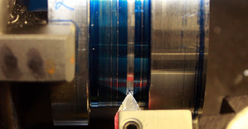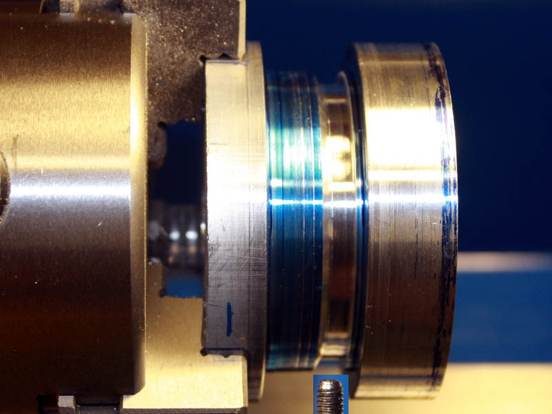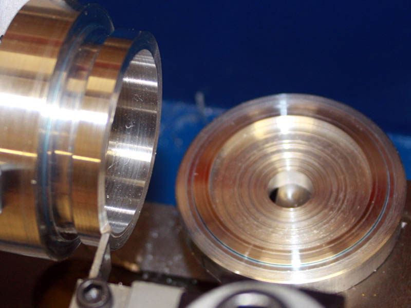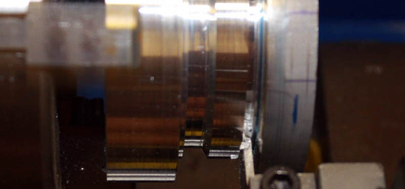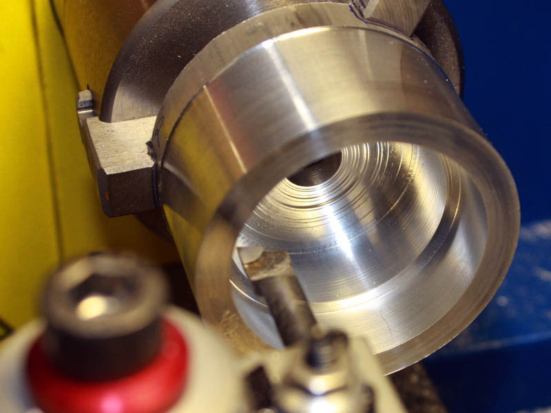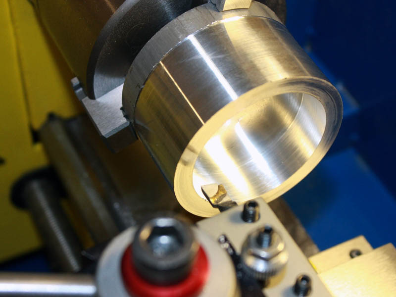 My mini-lathe is too small to allow positioning the tool to cut on the near side of the bore, so I had to cut on the far side. This required running the motor in reverse – the piece in this photo is rotating clockwise as viewed from the end. Running in reverse presents no problem thanks to the lathe's DC motor and controller. The lead screw was set to feed the tool out of the bore, so there was never any concern of feeding in too far.