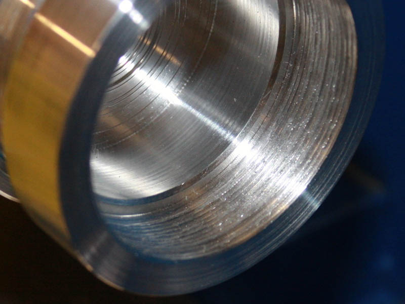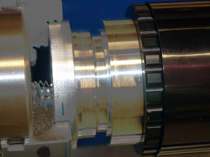 The threads are a bit rough, probably because my final cut was slightly deeper than intended. Nevertheless, they mate fine with the extension tube. This area incorporates the second improvement over the original adapter – a deeper hole with more threads. The original adapter's threaded hole was too shallow, forcing the extension tube's male threads to bottom-out in the adapter hole and leaving a 0.08" gap between the adapter and the tube. The connection was solid because the tube was bottomed, but I believe it's better for the external surfaces to mate. This spreads the load over a broader area, reducing forces on the joint.