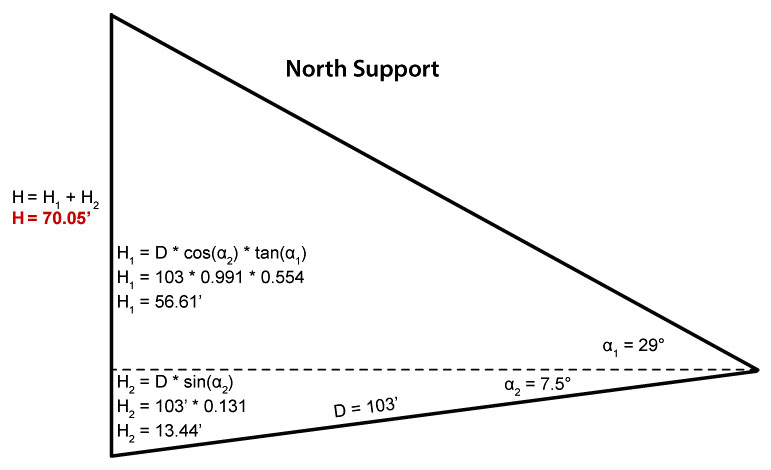 Note: The diagram shows the north support height as 70'. Initially I'd planned to use the crotch above the red arrow in the left photo above, but later I chose the lower crotch because it looks sturdier. This crotch is about 65' high, and angle α1 is a fraction of a degree less.