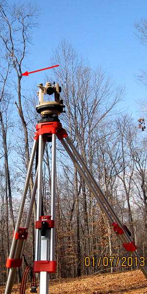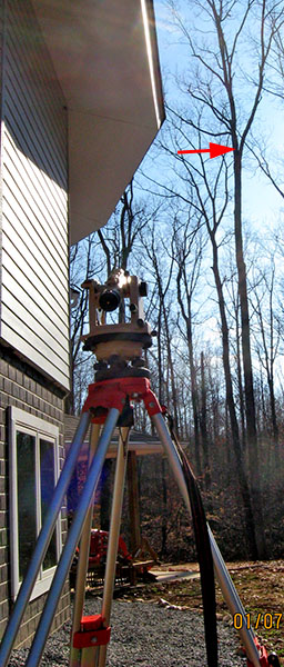 There are hundreds of trees around us, but how tall are the two I chose for antenna supports? I used a 300' tape measure to establish a baseline, and a theodolite to "shoot" some angles, then calculated the height of the support points (red arrows). The left photo shows the north support point, at 65' high, and the center photo shows the south point, at 58'.