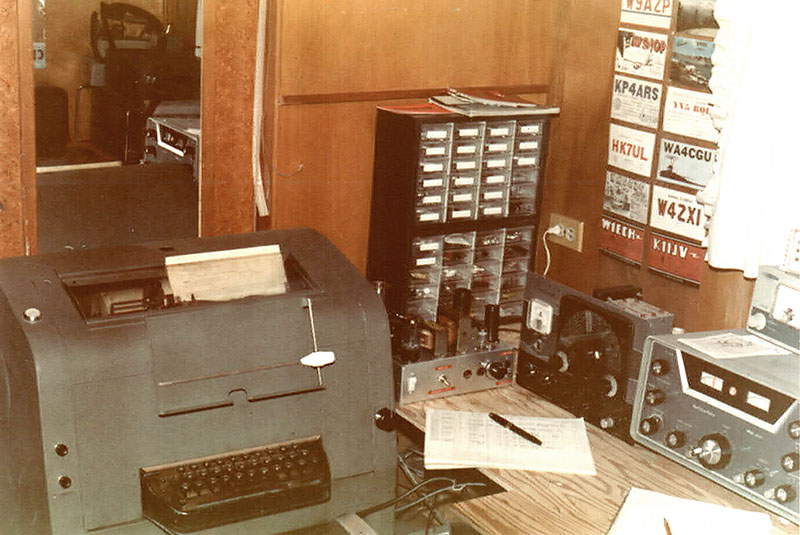 I dabbled in RTTY with this station. On the left is a MITE teleprinter that replaced the Western Union teleprinter. On top of the MITE is a homebrew "solid state tape reader" (reads the label). In front of the SX-117 is a homebrew keyboard that transmitted Baudot teleprinter codes. The keytops are shirt buttons with dry-transfer letters applied!