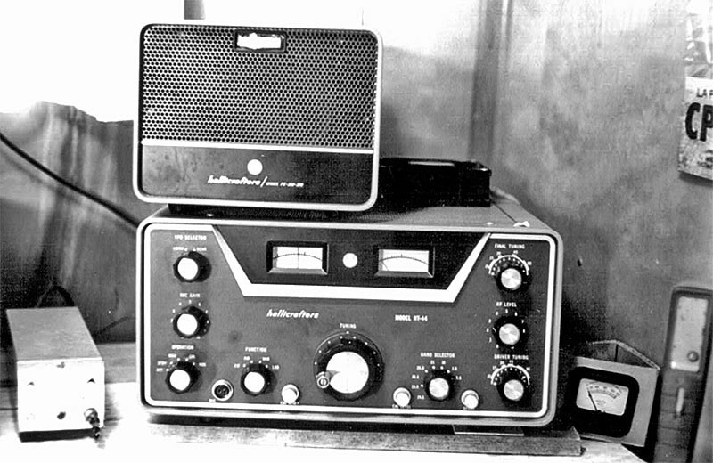 My transmitter was a Hallicrafters HT-44, a companion to the SX-117 receiver. A hallicrafters speaker rests on top, along with what appears to be a Whisper fan screwed to the transmitter case. Maybe it got hot running RTTY.