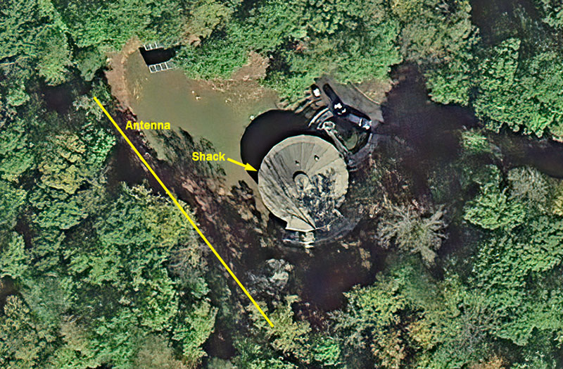 We live in an 18-sided house (an octadecagon) in the middle of 21½ forested acres. This satellite photo shows our house and the locations of the ham shack and Carolina Windom antenna.