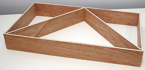 An article by Joe Brann in the Layout Design SIG's Journal #43 describes a method of making strong lightweight benchwork from thin lauan plywood braced like a Warren truss bridge. This is a wonderful idea. I bought a 4'x8' sheet ($10) and cut it lengthwise into 2" strips, then made a small section of benchwork to test the ease of construction and the resulting strength.