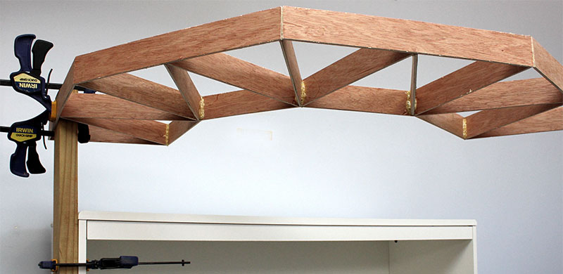 Truss benchwork is amazingly lightweight and strong. This entire section weighs only 1¾ pounds, yet can be held aloft by a single truss chord on one end, as seen here.